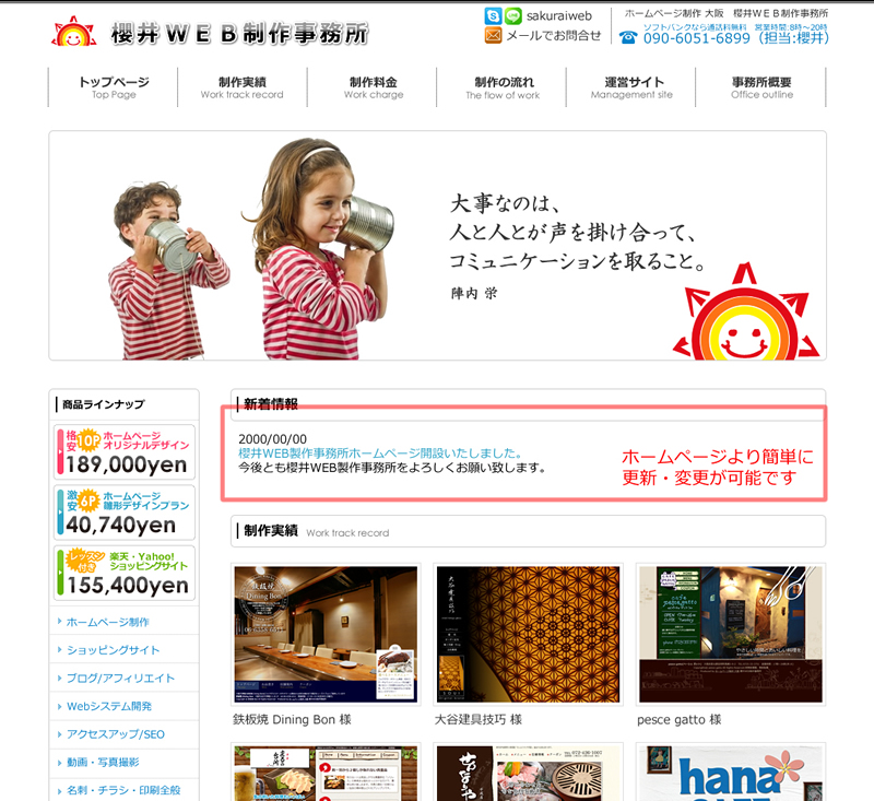 お好きなページ5P以内でお問い合わせフォームシステムとお客様でも簡単に更新できる新着情報更新システムがついて180,000円!ご納得いただけるまで何度でもデザインの修正OKです!